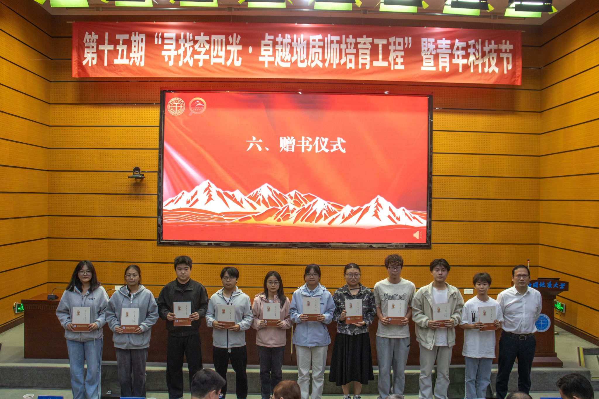 会议举行赠书仪式。湖北省李四光研究会副秘书长、湖北省地质科学研究院副院长杨良哲向学生代表赠送了《天文·地质·古生物》,激发同学们树立地质报国远大志向。该书由李四光先生编写,是由湖北省地质局于2022年出资再版的70周年纪念版。