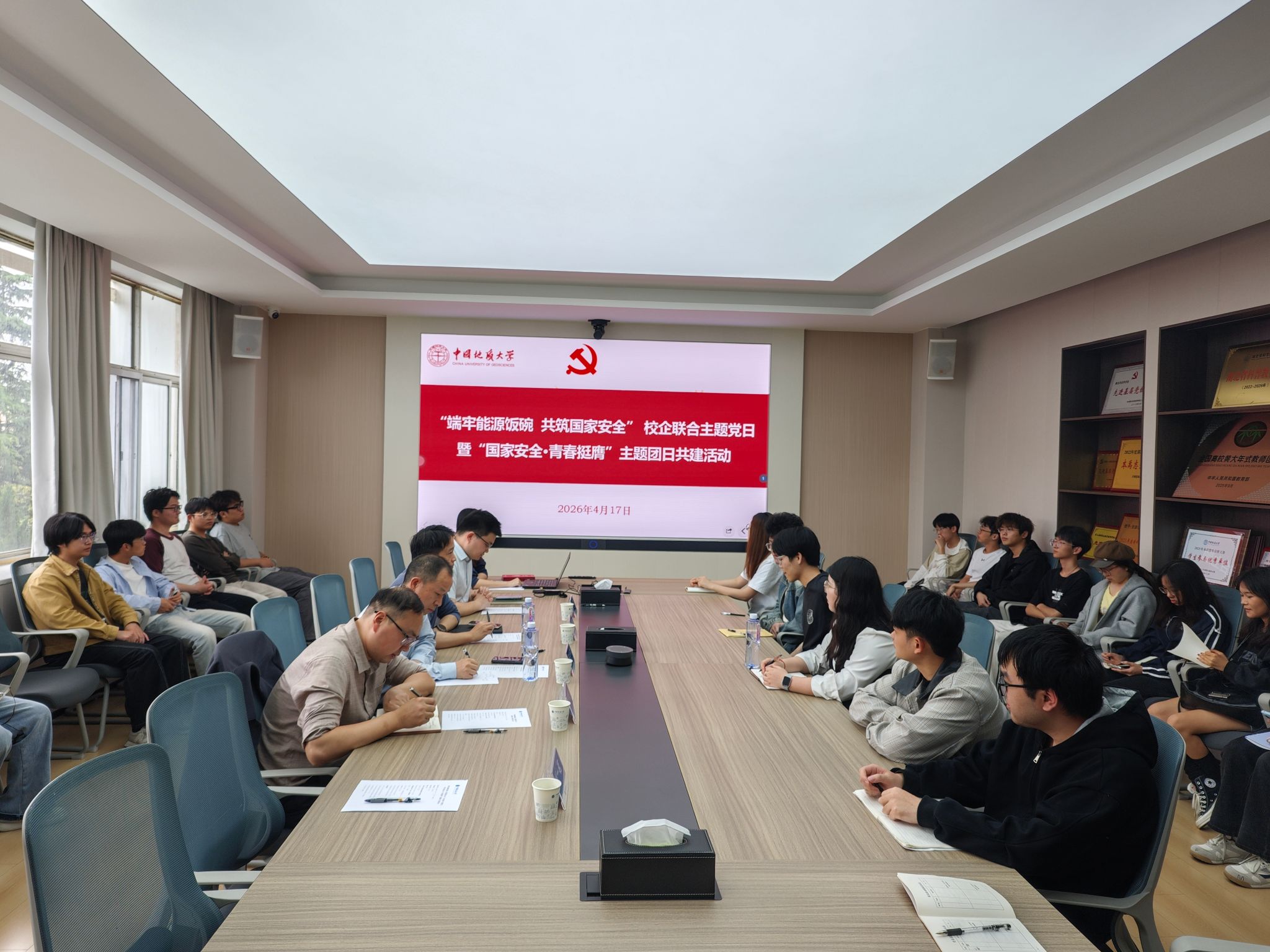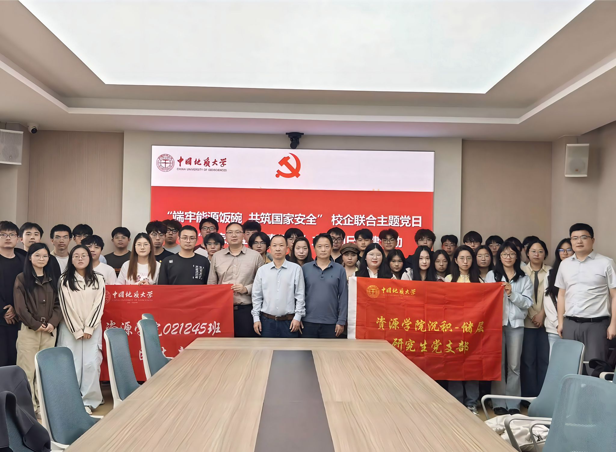 在主楼330会议室举行“端牢能源饭碗 共筑国家安全”校企联合主题党日暨“国家安全·青春挺膺”主题团日共建活动。中国石化胜利油田勘探开发研究院首席专家曾治平、勘探战略室党支部书记李松涛,福利姬