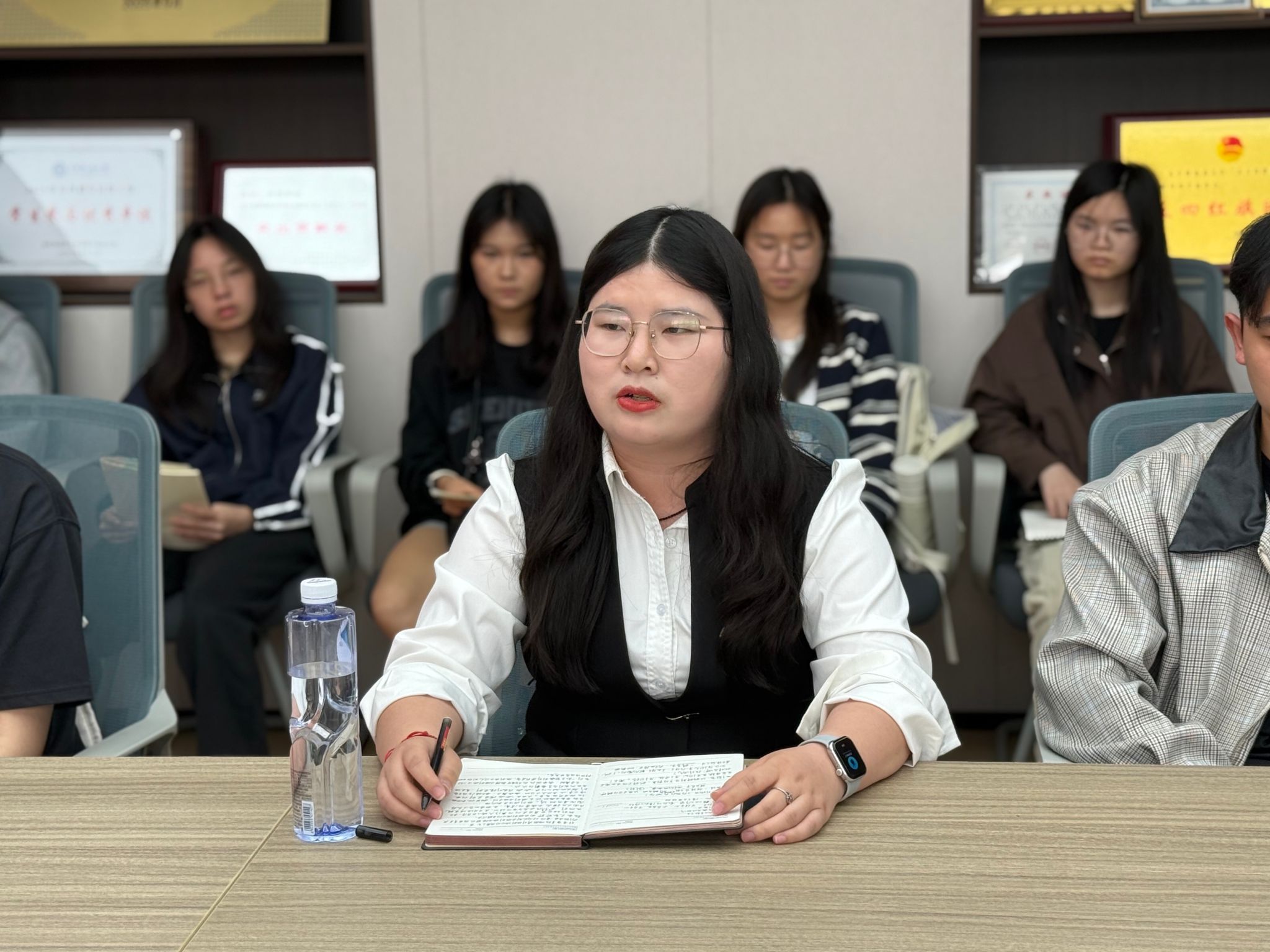 交流环节,沉积储层研究生党支部书记胡慧结合自己在胜利油田的实践经历,分享了一线工作的真实场景与成长体会。